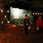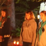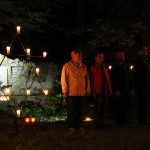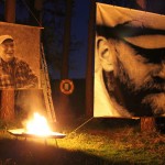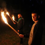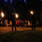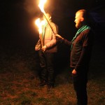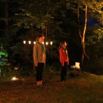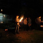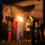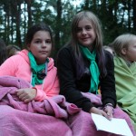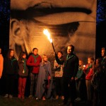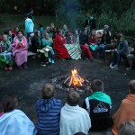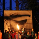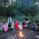 Kiedy obozowicze poznali już fundamentalne zasady i idee, które tu kultywujemy, nastąpiła przerwa. Po kolacji, około godziny 20:20 rozpoczął się kolejny program wieczorny- Wieczór Patrona. W kręgu ogniskowym zaprezentowane zostały przygotowane przez zastępy interpretacje myśli Korczaka. Większość z nich stanowiły krótkie scenki, jedynie zastęp, którym się opiekuję, XII, zaprojektował plakat. Muszę napisać, że podobało mi się to, w jaki sposób dzieci zrozumiały treść cytatów. Sporo pomysłów było ciekawych i widać było, że prawie wszyscy wzięli zadanie na poważnie i się przyłożyli. Kiedy prezentacje dobiegły końca, zaśpiewaliśmy kilka piosenek przy ognisku. Te ostatnie były coraz bardziej nastrojowe, wyciszające, przygotowywały do tego, co czekało uczestników na placu pod Pomnikiem. Podczas ostatniej piosenki, którą było „Ogniobranie”, czterech druhów podeszło z pochodniami do ogniska i je zapaliło. Dało to naprawdę świetny efekt, zrobili to w idealny sposób i w idealnym momencie, mam nadzieję, że chociaż część osób zrozumiało nawiązanie. Prowadzeni przez osoby trzymające pochodnie, wszyscy przeszli na plac pod Pomnikiem Janusza Korczaka, na którym zawieszone zostało zdjęcie naszego zmarłego rok temu Szefa. Ten moment dnia był chyba najważniejszy , być może nawet najważniejszy dla całego tegorocznego obozu . Myślę, że wielu uczestników stojąc pod Pomnikiem tego wieczoru zrozumiało istotę tego wszystkiego, co się dzieje na obozie, to, na czym wszystkim Korczakowcom zależy i ujrzeli to, co chcemy osiągnąć. Budowanie lepszej przyszłości, trwałe powiązanie z przeszłością, z wyjątkowym człowiekiem, który „wybrał śmierć, choć kto wie, bo może wybrał miłość”, jak losy jednego człowieka mogą wpłynąć na cały świat, okrucieństwo wojny. To wszystko zostało ukazane w subtelny sposób wierszami, czytanymi przez uczestników, piosenkami, granymi na gitarach i śpiewanymi, teatrem cieni, patronkami (czyli pamiątkowymi kartkami z jakąś ważną sentencją dot. Korczaka i Korczakowców) pod Pomnikiem.