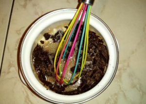 1.W małym garnuszku, na małym ogniu lub na niskim grzaniu kuchenki, rozpuść masło, mieszając. Gdy już jest prawie całe płynne, zdejmij z ognia i dodaj 150g posiekanej gorzkiej czekolady i dokładnie mieszaj. Jeśli trzeba, to jeszcze na chwile podgrzej na kuchence – uważaj, czekolada ma się tylko rozpuścić, nie może mocno się podgrzać i absolutnie nie zagotować! Odstawiamy.