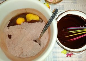 2. W misce wymieszaj łyżką mąkę, kakao, cukry, sodę (lub proszek) i sól. Następnie wbij 2 jajka, wlej masę czekoladową i wymieszaj.