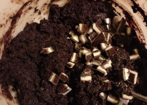 * dodatkiem może być 50g czekolady gorzkiej, bo tyle zostało z wóch tabliczek po posiekaniu 150gramów (jeśli wolicie mniej słodkie) lub mlecznej. Ja tym razem dałam czekoladę miętową nadziewaną. Pysznym dodatkiem będą orzechy. Dowolne, ale przed posiekaniem trzeba ja koniecznie uprażyć na suchej patelni. Jeśli zdecydujecie się na prażone orzeszki ziemne solone, to oczywiście ich już nie prażymy i możemy pominąć ¼ łyżki soli. J