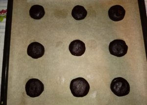 6. Łyżką wyciągaj mała porcję ciasta i między dwiema dłońmi zrób kulkę. Nie powinno kleić się do rąk. Rób kulki mniej więcej wielkości orzecha włoskiego (mniejsze niż piłeczka do ping-ponga) i układaj na blasze. Rób odstępy między porcjami. Ja najpierw ułożyłam 12 kulek (widać ślady), ale potem zmieniłam na 9 – i dobrze, bo ciasteczka trochę się rozlewają i rosną.