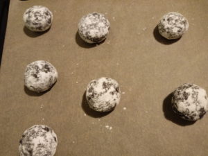 8. Gdy pieką się ciastka z pierwszej partii przygotuj drugą blachę ciastek. Jak widzisz, ja je leciutko obtoczyłam w cukrze pudrze, ale to nie jest konieczne.
