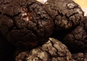 * dodatkiem może być 50g czekolady gorzkiej, bo tyle zostało z wóch tabliczek po posiekaniu 150gramów (jeśli wolicie mniej słodkie) lub mlecznej. Ja tym razem dałam czekoladę miętową nadziewaną. Pysznym dodatkiem będą orzechy. Dowolne, ale przed posiekaniem trzeba ja koniecznie uprażyć na suchej patelni. Jeśli zdecydujecie się na prażone orzeszki ziemne solone, to oczywiście ich już nie prażymy i możemy pominąć ¼ łyżki soli. J