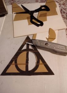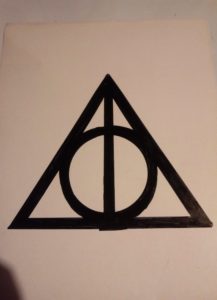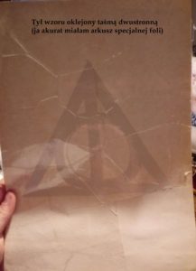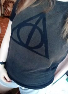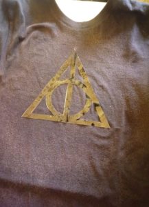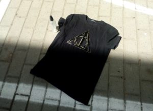 1. Najpierw wymyślamy, jaki wzór chcemy mieć na koszulce. Najlepiej, żeby był to dość prosty kształt. Ja wybrałam Insygnia Śmierci z książki Harry Potter, ale może to być księżyc, ptaszek, serduszko, kształt Sokoła Millenium – przy tym punkcie możecie puścić wodze wyobraźni. Wzorów może być kilka na jednej koszulce (na przykład większe i mniejsze gwiazdki – super efekt). Można też po porostu popsikać koszulkę, na górze bardziej a im niżej, tym mniej, lub odwrotnie – efekt również jest ciekawy.