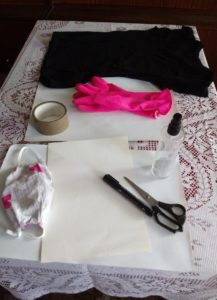 – Folia malarska lub karton lub inny nieprzemakalny materiał (na przykład cerata) – duży kawałek do zabezpieczenia podłoża oraz mniejszy do oddzielenia warstw koszulki
