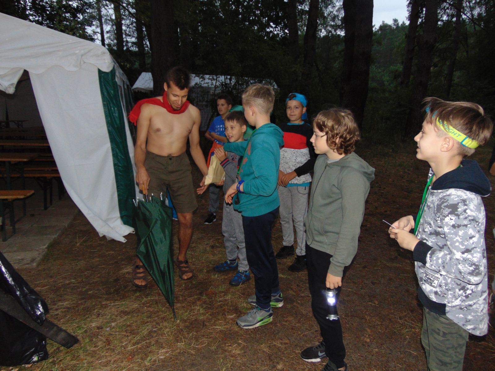 W ramach zajęć zabraliśmy się za robienie totemów. Wszyscy mieli świetne pomysły, miedzy innymi: szop pracz, strefa chillu, emotka, plac trzech żywiołów. Po skończeniu pracy mieliśmy czas wolny na kajaki, kąpiel, piłkę, a potem zjedliśmy pyszne kotlety. Po krótkim poobiednim odpoczynku udaliśmy się na boisko, gdzie odbyły się zabawy integracyjne. Zorganizowano też nabór do obozowej ligi piłki nożnej. Po kolacji przygotowaliśmy się do otwarcia obozu. Zebraliśmy się w Kręgu, gdzie druhowie zaskoczyli nas magicznym światem „Opowieści z Narnii”. Pod koniec spaceru przez Narnię, kiedy wykonaliśmy wiele zdań, otrzymaliśmy chusty. Następnie udaliśmy się do namiotów i poszliśmy spać.