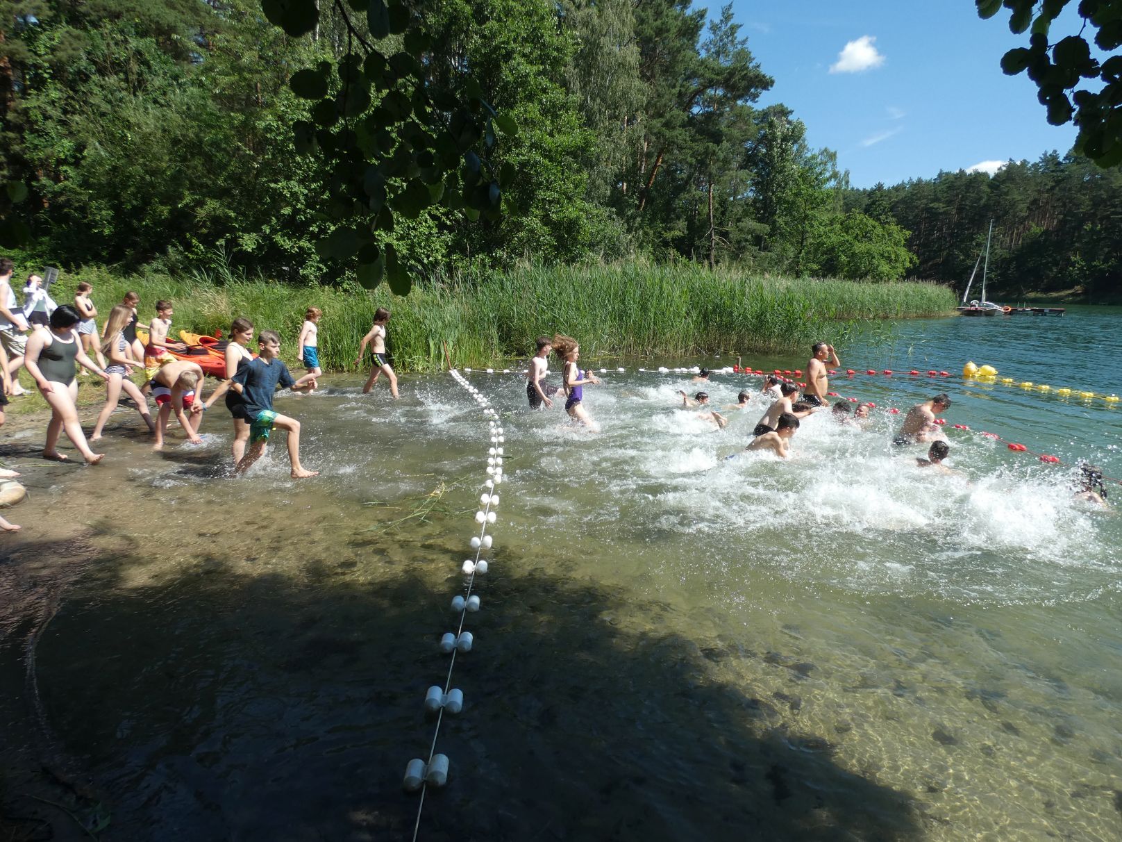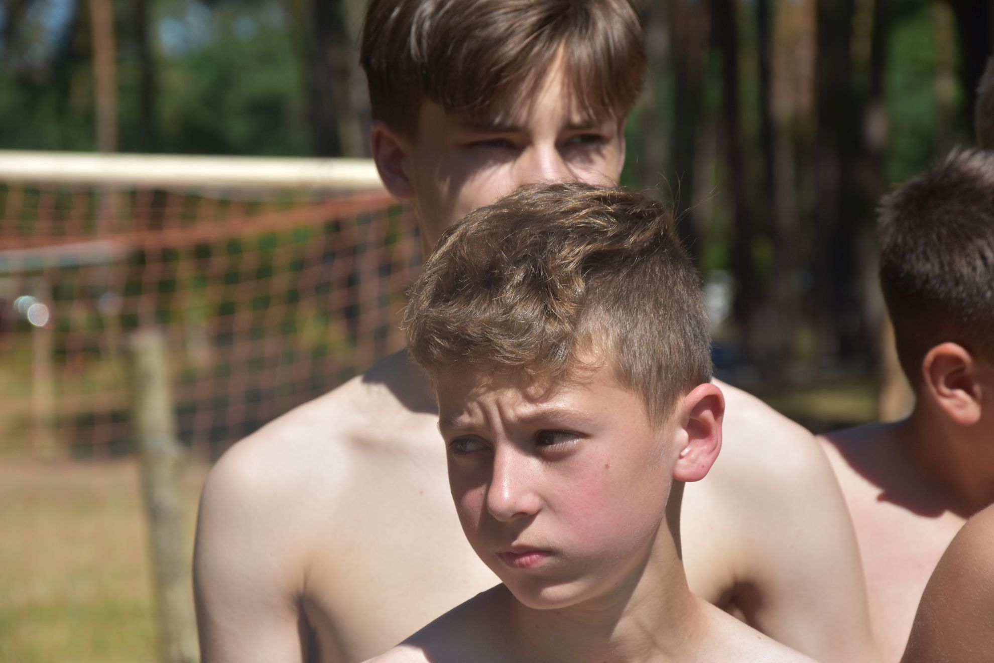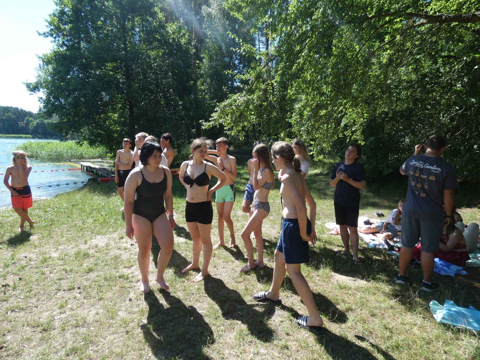 Dzień zaczęliśmy rozbudzającą zaprawą poranną. Następnie odbył się apel, podczas którego dowiedzieliśmy wszelkich szczegółów o zajęciach, które zaplanowano na ten dzień. Przed południem odbyła się Olimpiada Wodna, podczas której na kąpielisku odbywały się różne konkurencje. Dzień był upalny, więc woda lała się strumieniami z wiader i butelek na wszystkich bez wyjątku. Poza znanymi już z lat poprzednich konkurencjami braliśmy udział w nowych zadaniach, jak na przykład nawigowanie za pomocą komend kajakarza płynącego z zawiązanymi oczami. Okazało się to bardzo trudne, a Maciek wylądował w trzcinach. Śmiechu było mnóstwo. Wszyscy świetnie się bawili, a gdy olimpiada dobiegła końca rozpoczął się czas wolny, podczas którego uczestnicy mieli okazję się zrelaksować i przyjemnie spędzić czas. Następnymi zajęciami były przygotowania do Bajkolandii, podczas których wszystkie zastępy rozpoczęły planowanie swoich występów, które nazajutrz miały ujrzeć światło dzienne. Wieczór spędziliśmy- jak każdy inny – śpiewając i pląsając wspólnie