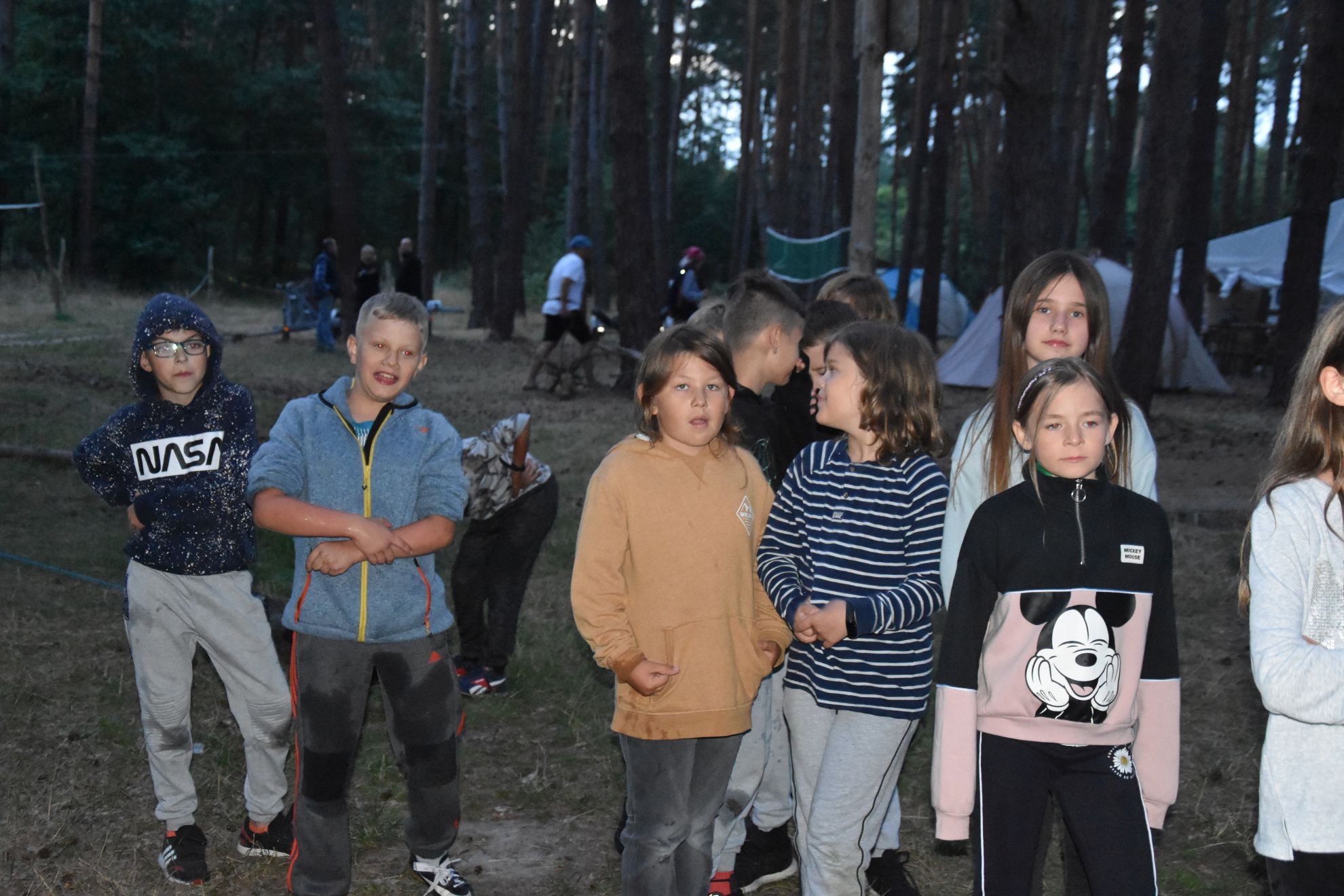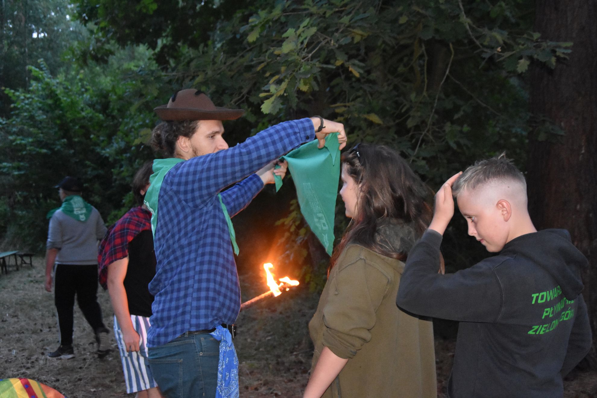 Wieczorem, na oficjalne otwarcie obozu, odbyło się pirackie przedstawienie, przygotowane przez kadrę. Musieliśmy pokonać tor przeszkód, a wszyscy druhowie się wygłupiali. Każdy, kto go przeszedł, dostawał korczakowską, zieloną chustę. Pochodniami piratów zapaliliśmy ognisko. Śpiewaliśmy i pląsaliśmy dłuższy czas, a potem, po kręgu, poszliśmy umyć zęby i spać. W czasie tego dnia wszyscy poznaliśmy dużo nowych osób.