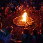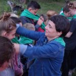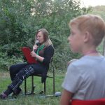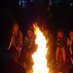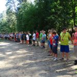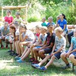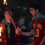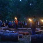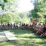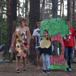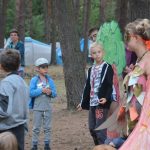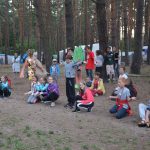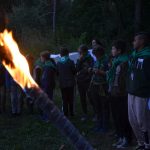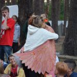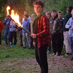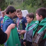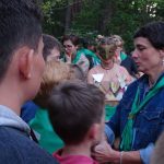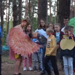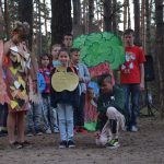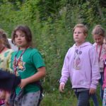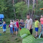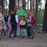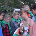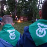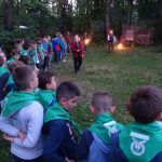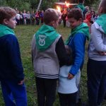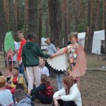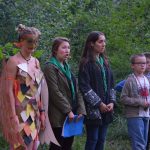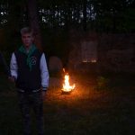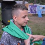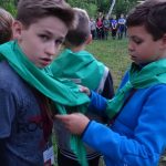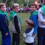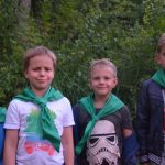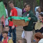 Wieczorem odbyło się uroczyste otwarcie obozu. Była bajka interaktywna, w której wielu z uczestników miało do odegrania jakąś rolę. Dominik Dzierzbicki z naszego zastępu był wietrzykiem i bardzo był zadowolony ze swojego występu. W naszej bajce sroczka porwała złote jabłko, dzieci poprosiły ją, by oddała, za to Sówka dała sroczce dla dzieci skarb czyli obozowe chusty. Druhna Komendantka założyła je nam pod Pomnikiem Janusza Korczaka. Potem było pierwsze ognisko i pierwszy krąg. Iskierka po pewnych problemach dotarła, choć nie wszyscy są pewni, czy na pewno. Zmęczeni poszliśmy spać.