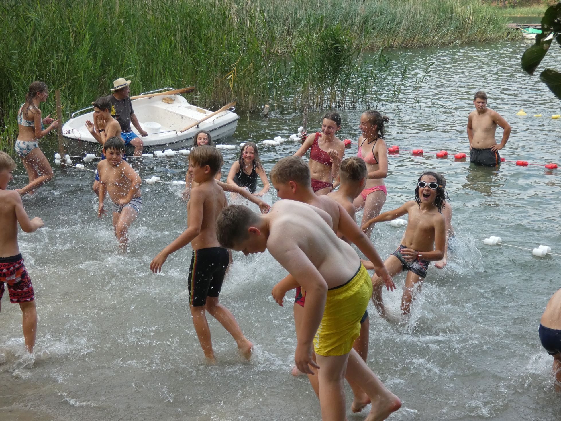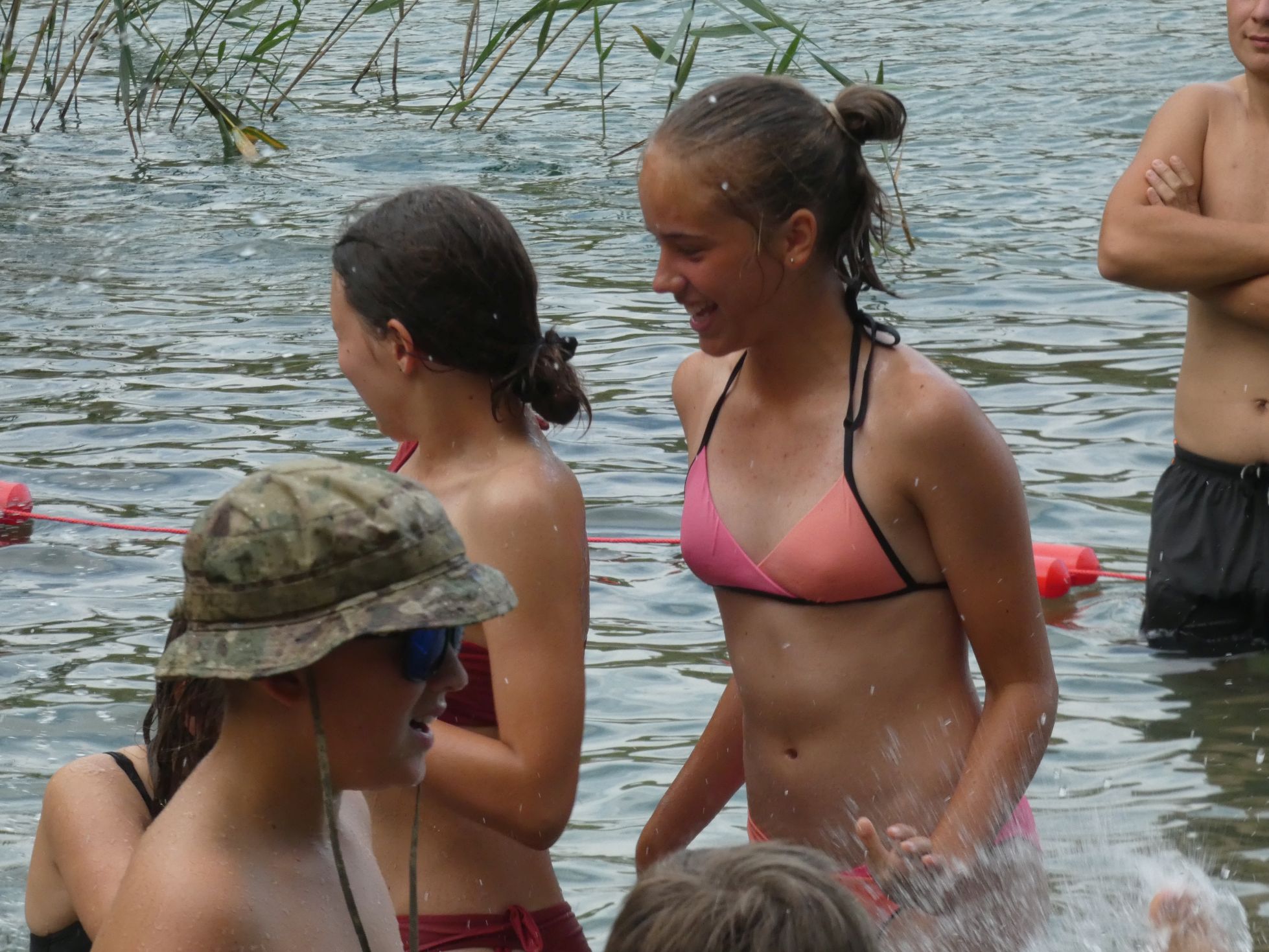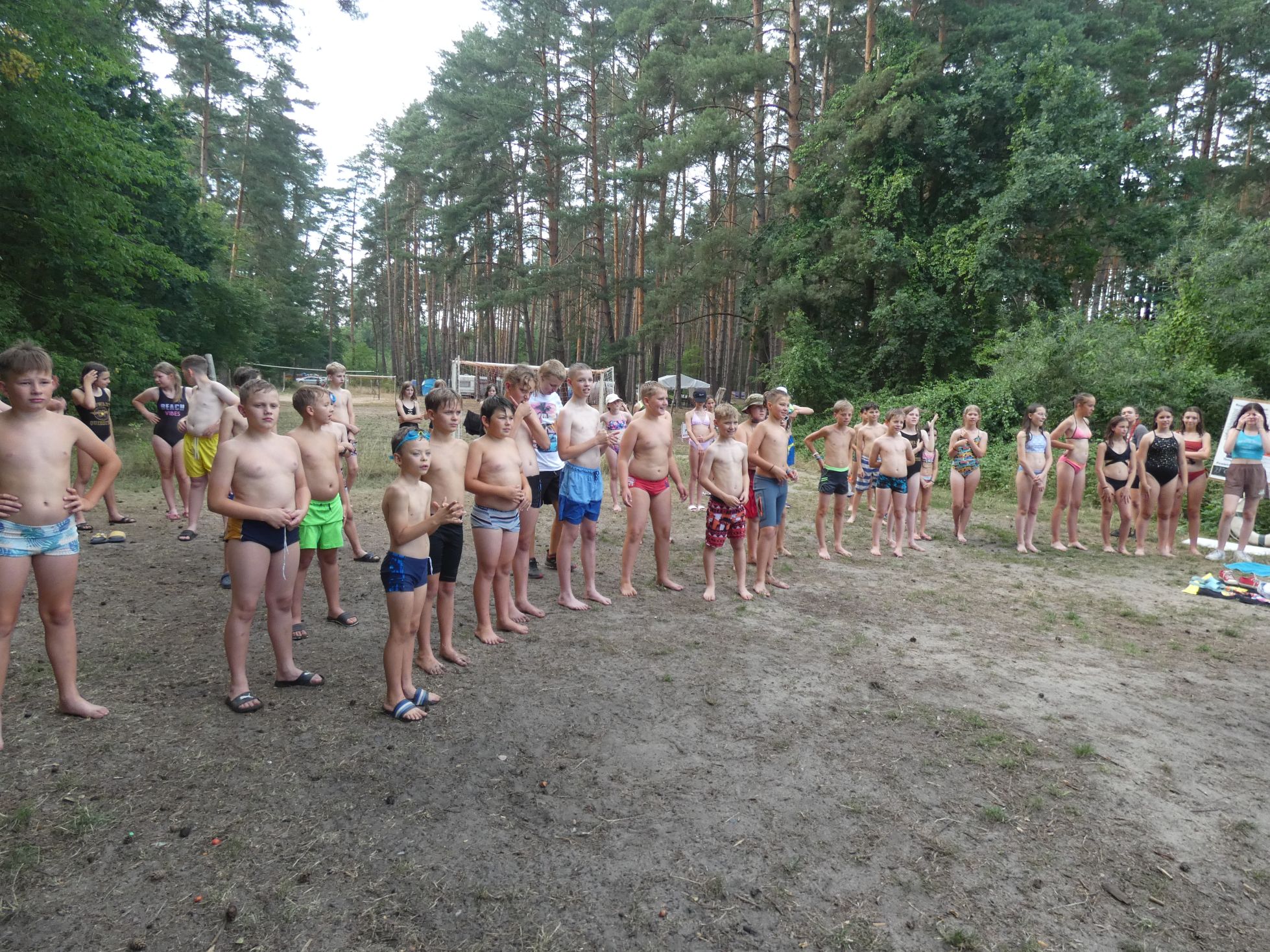 Popołudniu były pląsy i zabawy ruchowe np. pony, murarz albo przekrzykiwanie się (nawet zabawne, ale trochę bolały gardła niektórych) i gry w wodzie, bo było bardzo ciepło. Polegały one np. na chlapaniu. 🙂 Zrobiliśmy też próbę ewakuacji, tak na wszelki wypadek, żeby było bezpiecznie.