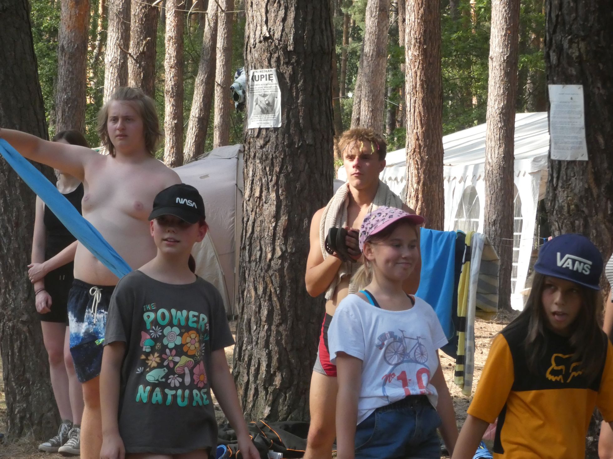 Wstaliśmy przy dźwiękach muzyki o godzinie 8 i jak każdy się ubrał to poszliśmy na zaprawę poranną i śniadanie. Po śniadaniu robiliśmy totemy, czyli takie figurki/posągi, które stoją przed namiotem. My zrobiłyśmy czerwoną pandę z numerem dziesięć jak nasz namiot. Panda wyszła trochę jak wiewiórka. Zastęp 4 zrobił bardzo fajnego minionka i w ogóle to były fajne zajęcia. Gdy jakaś grupa skończyła wcześniej to można było iść na kąpielisko, kajaki albo na boisko. Gdy wszyscy skończyli to mieliśmy chwile odpoczynku i obiad.