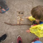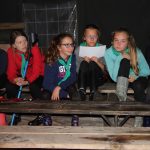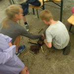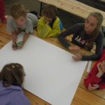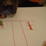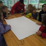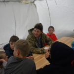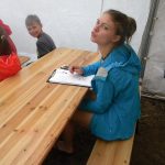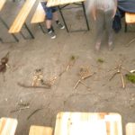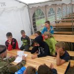 Po obiedzie rozpoczęliśmy „ Bieg z Patronem”. Pogoda trochę nie dopisywała, ale bawiliśmy się świetnie. Byliśmy podzieleni na 8 grup i początkowo przechodziliśmy od stanowiska do stanowiska. Kiedy zaczęło mocniej padać, zostaliśmy tam, gdzie akurat pracowaliśmy czyli z dh. Robin i tam wykonaliśmy resztę zadań. Dowiedzieliśmy się, że nie jest znana dokładna data urodzenia Janusza Korczaka, oraz że pisał książki dla dorosłych i dla dzieci, a także, że pracował w gazecie, był lekarzem i wychowawcą. Mieliśmy zinterpretować też cytaty z Korczaka i namalować do nich plakaty. Było przy tym dużo zabawy. Inne zadanie to kalambury dotyczące Korczaka i rysowanie komiksu na piasku. Deszcz nam w niczym nie przeszkodził.