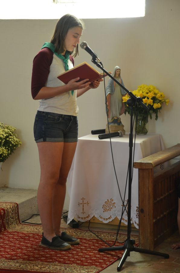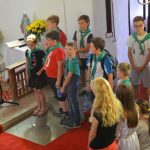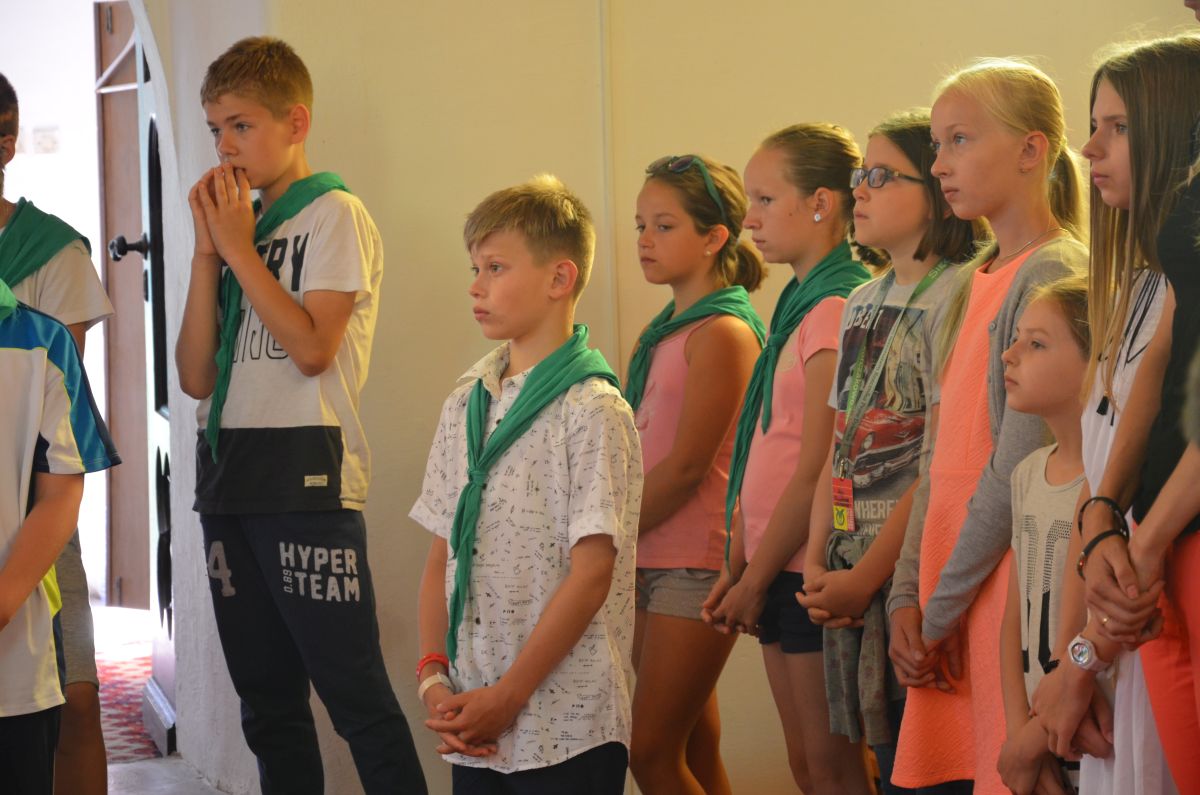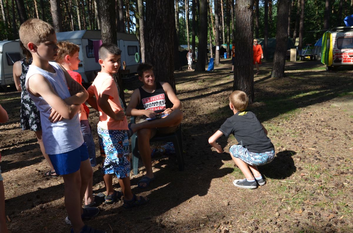 Wczoraj jak zwykle wstaliśmy o 8.00 i poszliśmy na posiłek. Poprzedniego dnia zostaliśmy poinformowani o tym, że trzeba szybko zjeść niedzielne śniadanie, ponieważ rano mamy iść do kościoła. Zjedliśmy więc szybko i wyruszyliśmy w drogę. Podczas marszu dokuczał straszny upał, a na drodze nie było ani skrawka cienia. Po pół godzinie dotarliśmy do celu. Niektórzy skierowali się z opiekunami na plac zabaw, a większość weszła do kościoła. Podczas Mszy dh. Ola, dh. Kasia i dh. Rucio grali na gitarach. Napiliśmy się wody i wróciliśmy do Korczakowa. Tu otwarte było kąpielisko i mieliśmy czas wolny. Do wielu osób przyjechali rodzice.