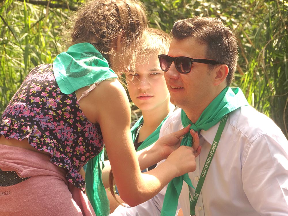 Cały obóz przywitał pana Rzecznika w kręgu na apelu. Gość został jednym z nas, gdy druhna Ata zawiązała mu chustę. Potem usiedliśmy wspólnie w kręgu – bez ogniska, ale przy piosenkach i pląsach. Oczywiście nie zabrakło silnego akcentu praw dzieci i zasług Korczaka w tej dziedzinie. Warto zaznaczyć, że udało nam się zaskoczyć Rzecznika Praw Dziecka – nie wiedział, że to w Korczakowie powstał pierwszy na świecie pomnik Janusza Korczaka.